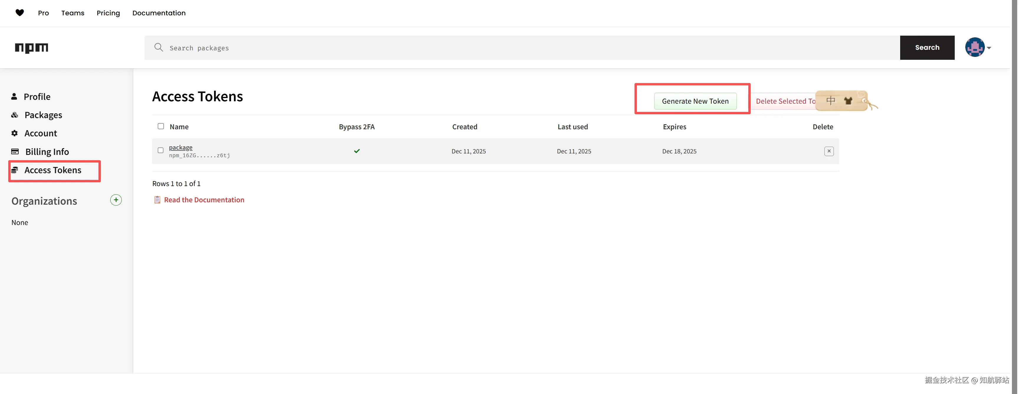 流程-登录 npm 官网 -> Avatar -> Access Tokens -> Generate New Token -> 选 Automation / Granular Access Token,确保有 publish 权限且支持 Bypass 2FA