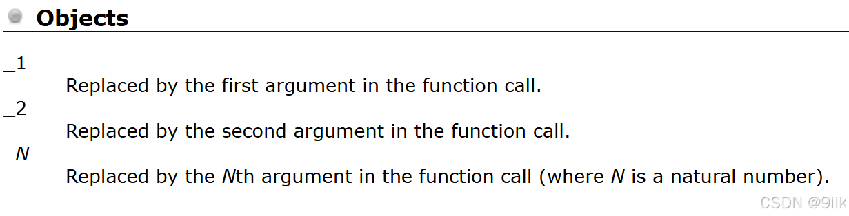 arg_list中的参数可能包含形如_n的名字,其中n是一个整数,这些参数是"占位符",表示 newCallable的参数,它们占据了传递给newCallable的参数的"位置"。数值n表示生成的可调用对 象中参数的位置:_1为newCallable的第一个实参,_2为第二个实参,以此类推。