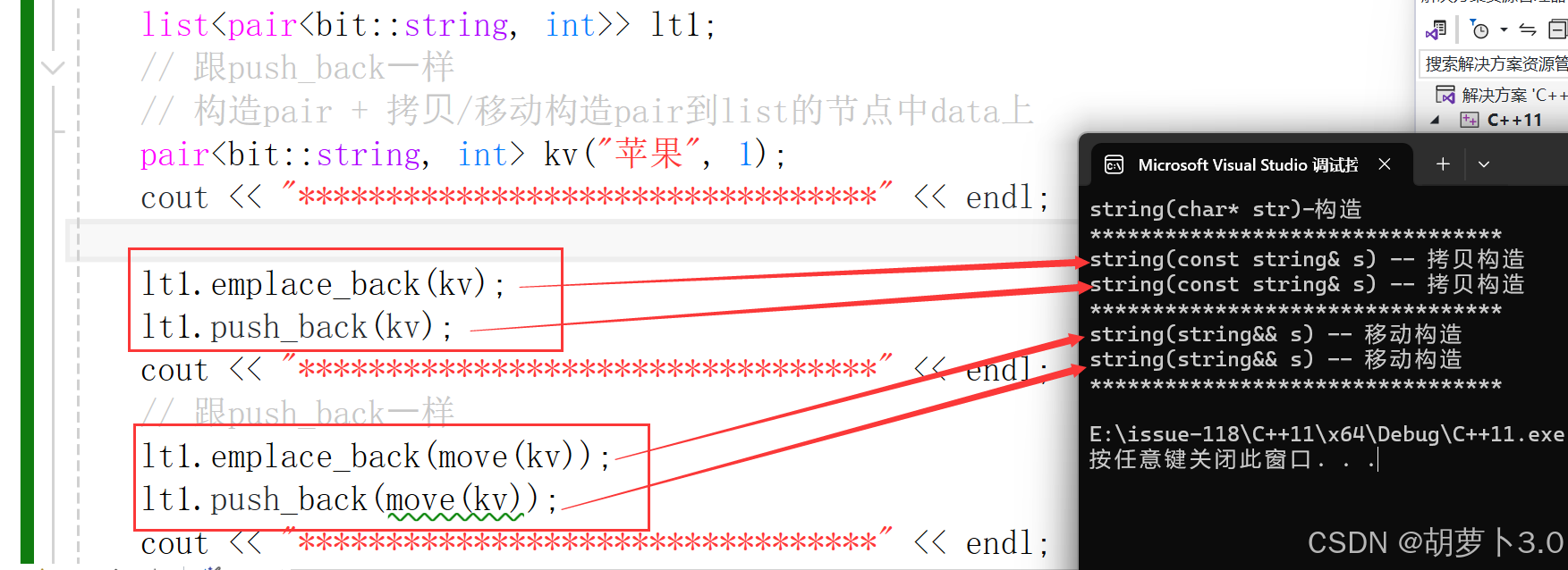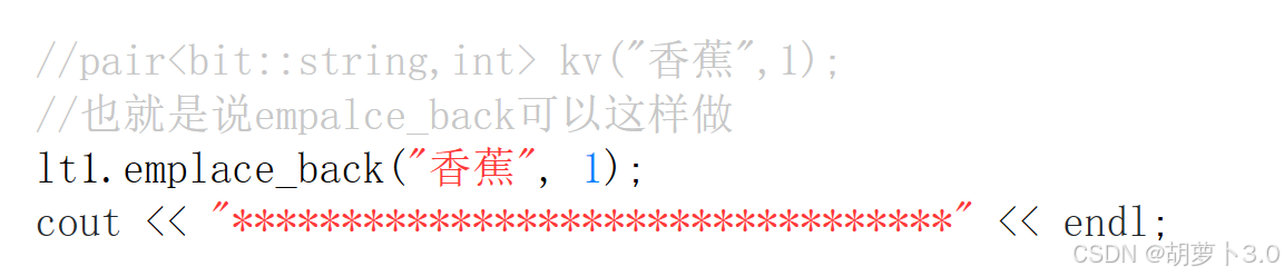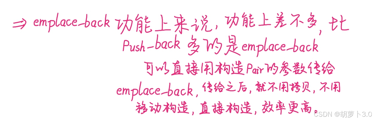 但是emplace_back可以直接把构造pair参数包传下去,直接用pair参数包构造pair,这个效果push_back是做不到的