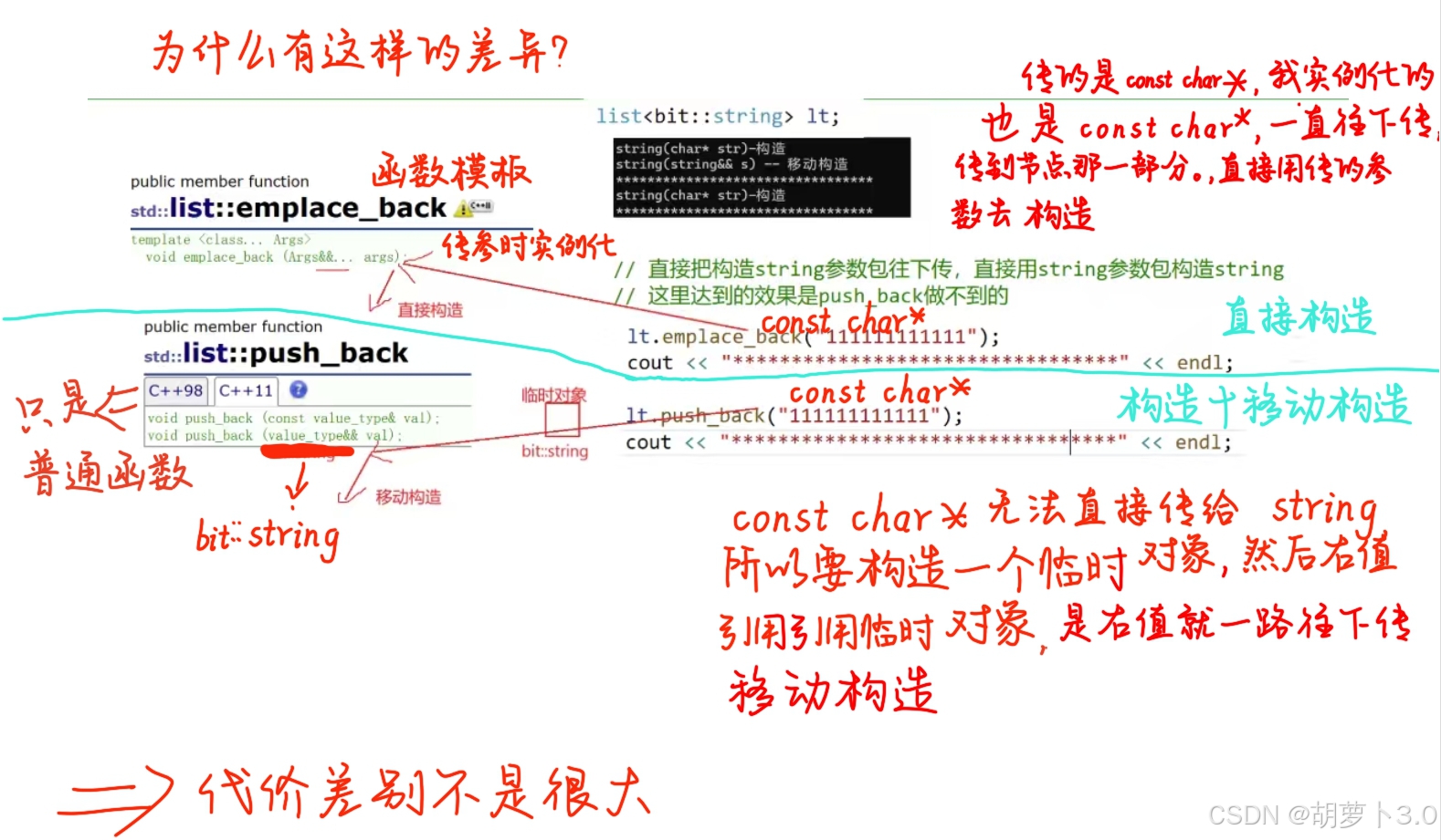 我在list中,直接插入一个string,对于emplace_back来说,就是直接构造;而对于push_back来说却是构造+移动构造。这是为什么?