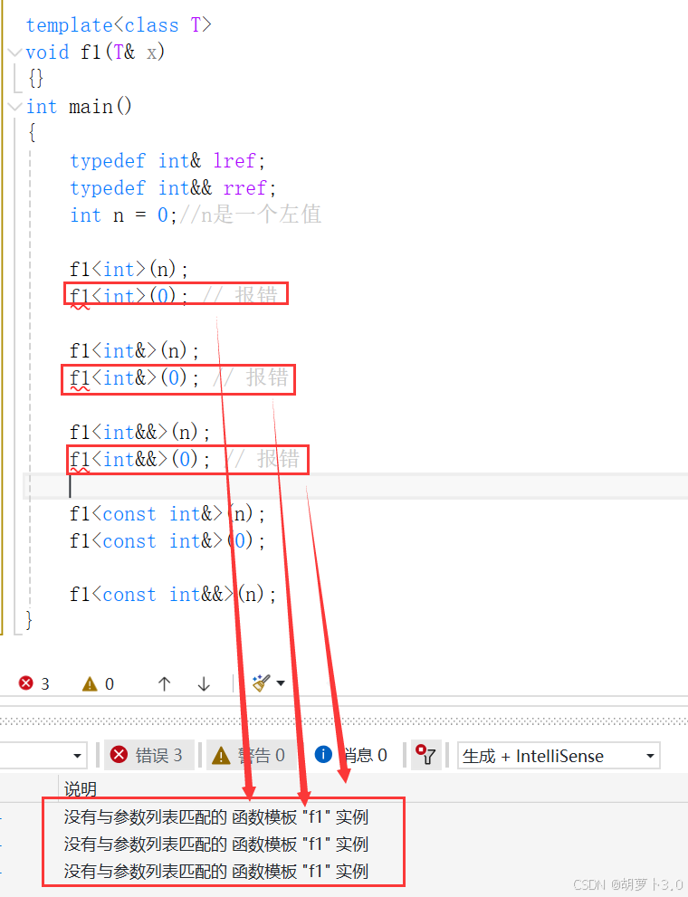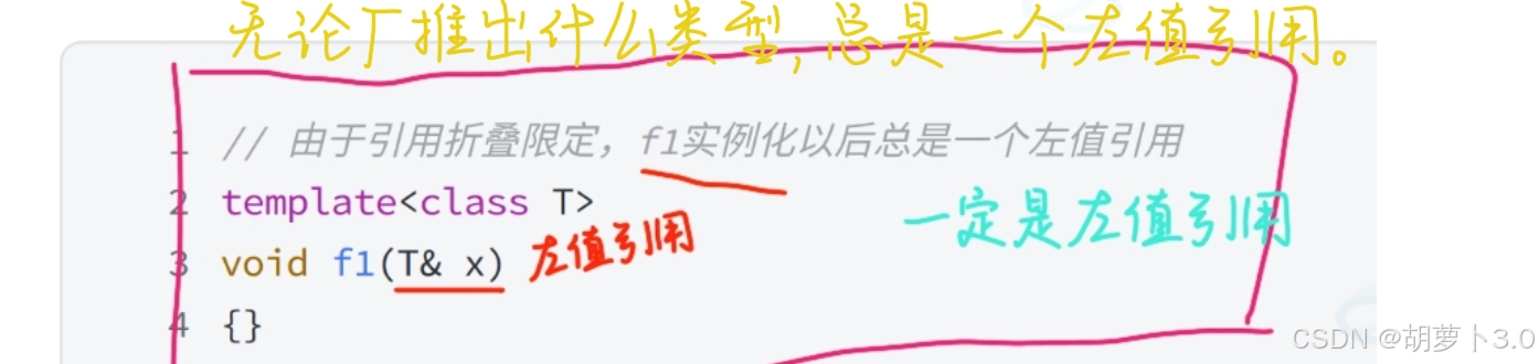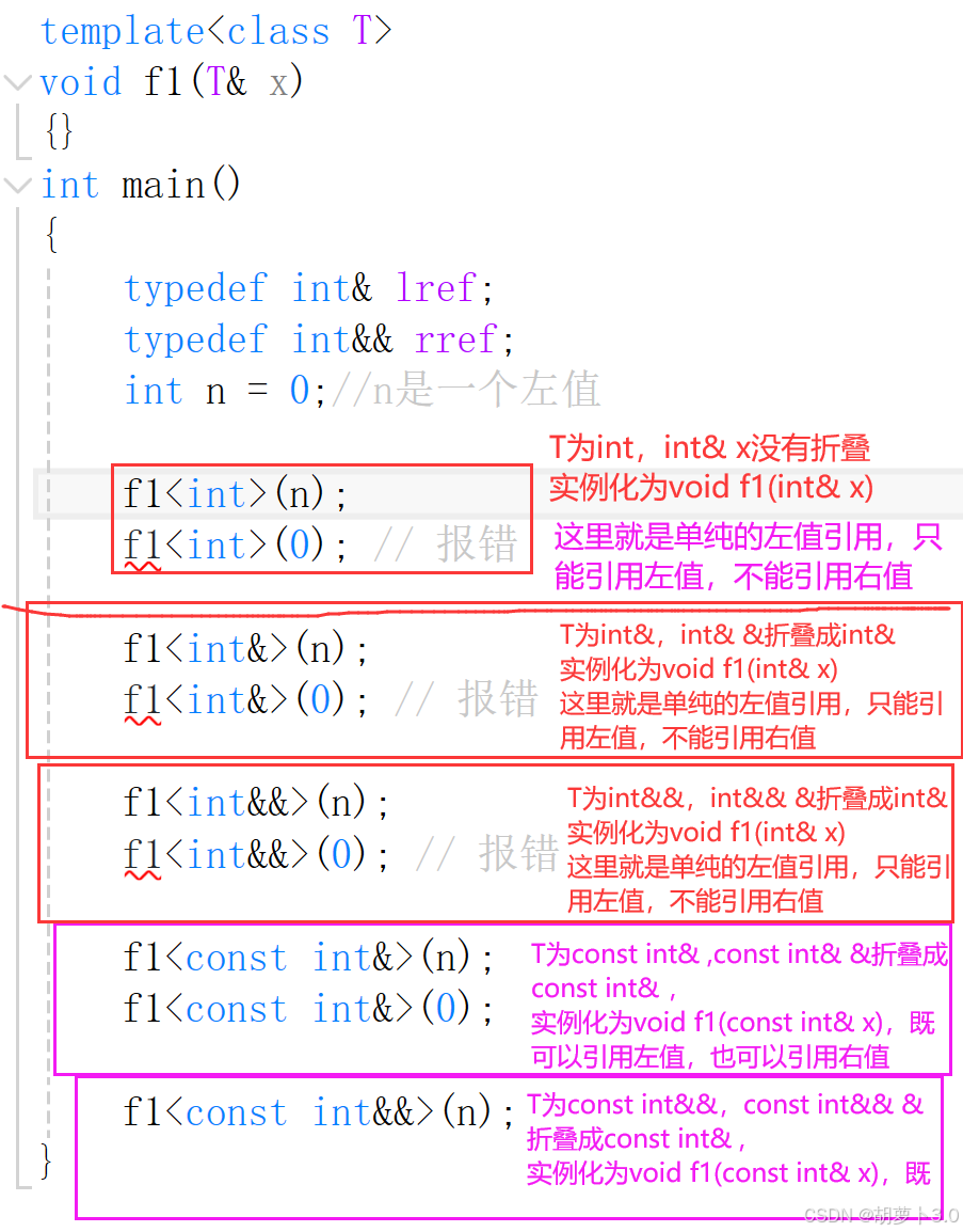 不知道有没有uu发现了什么?我们这里的模板函数的参数是一个左值引用,由于这里引用折叠的限定,f1实例化后总是一个左值引用