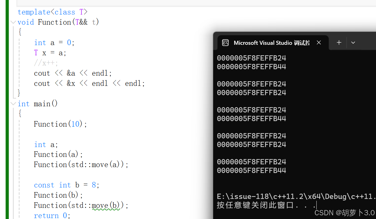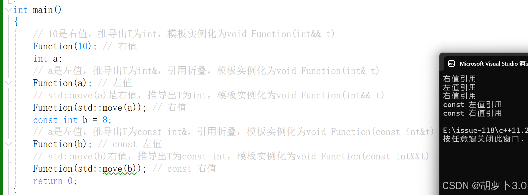 ok,这是一个模板函数的参数是左值引用的情况,接下来我们来看一下模板函数的参数是右值引用的情况------