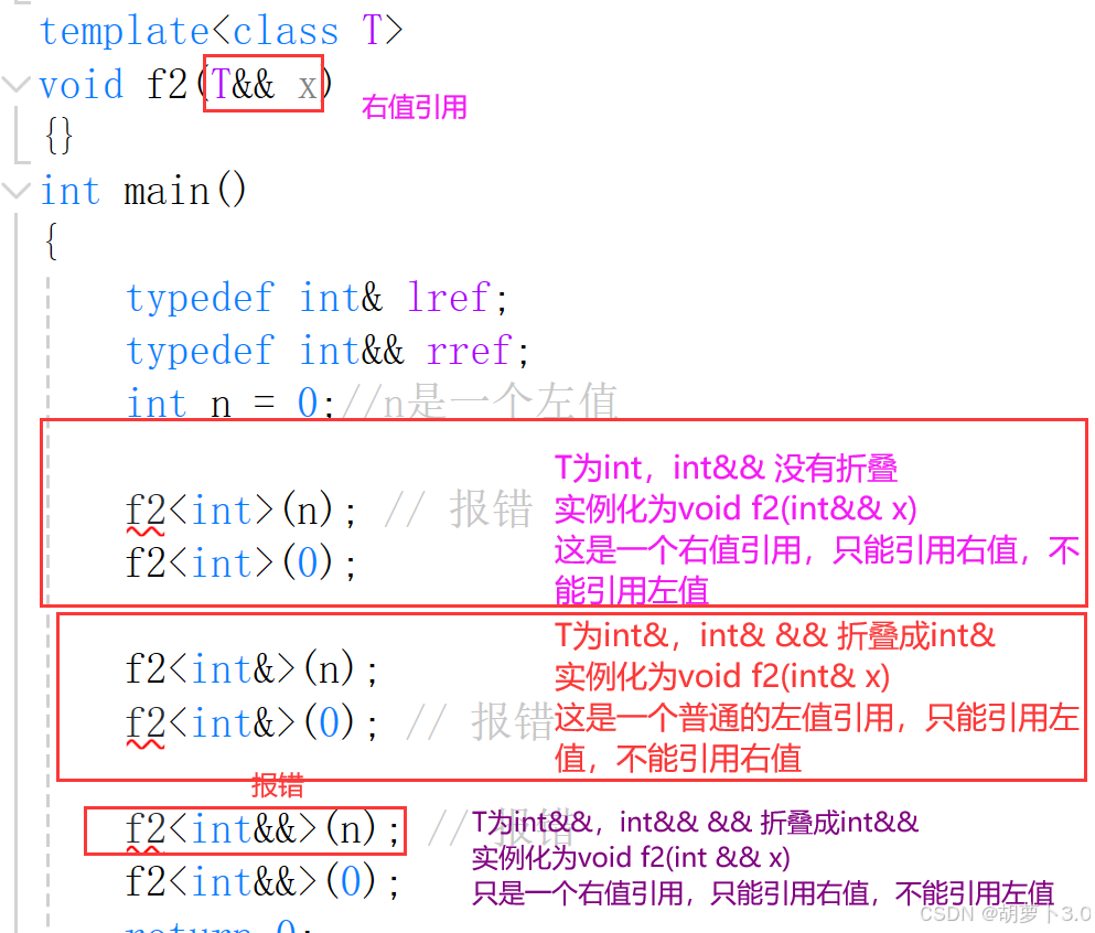 我们通过模板或者typedef中的类型操作可以构成引用的引用时,这时C++11给出了一个引用折叠的规则:右值引用的右值引用折叠成右值引用,所有其他组合均折叠成左值引用。