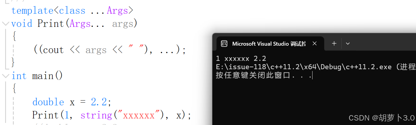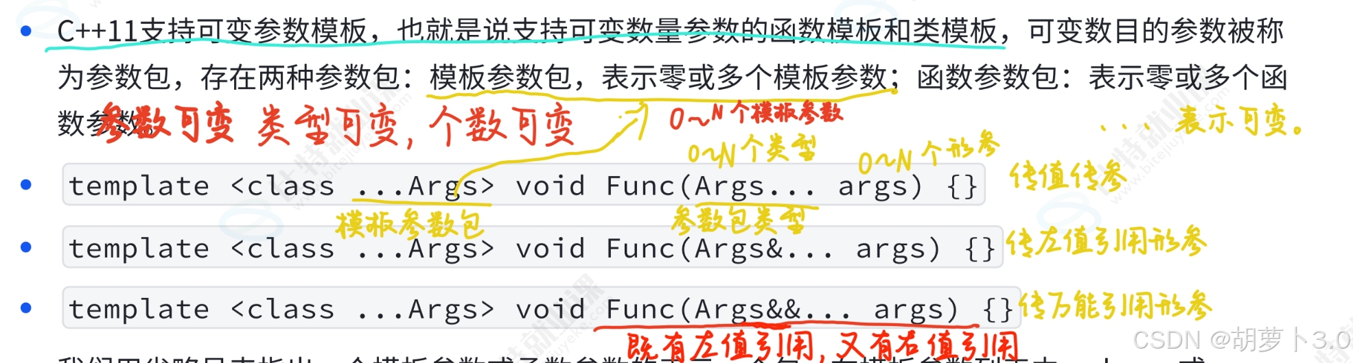 C++11支持可变参数模板,也就是说支持可变数量参数的函数模板和类模板,可变数目的参数被称为参数包,存在两种参数包: