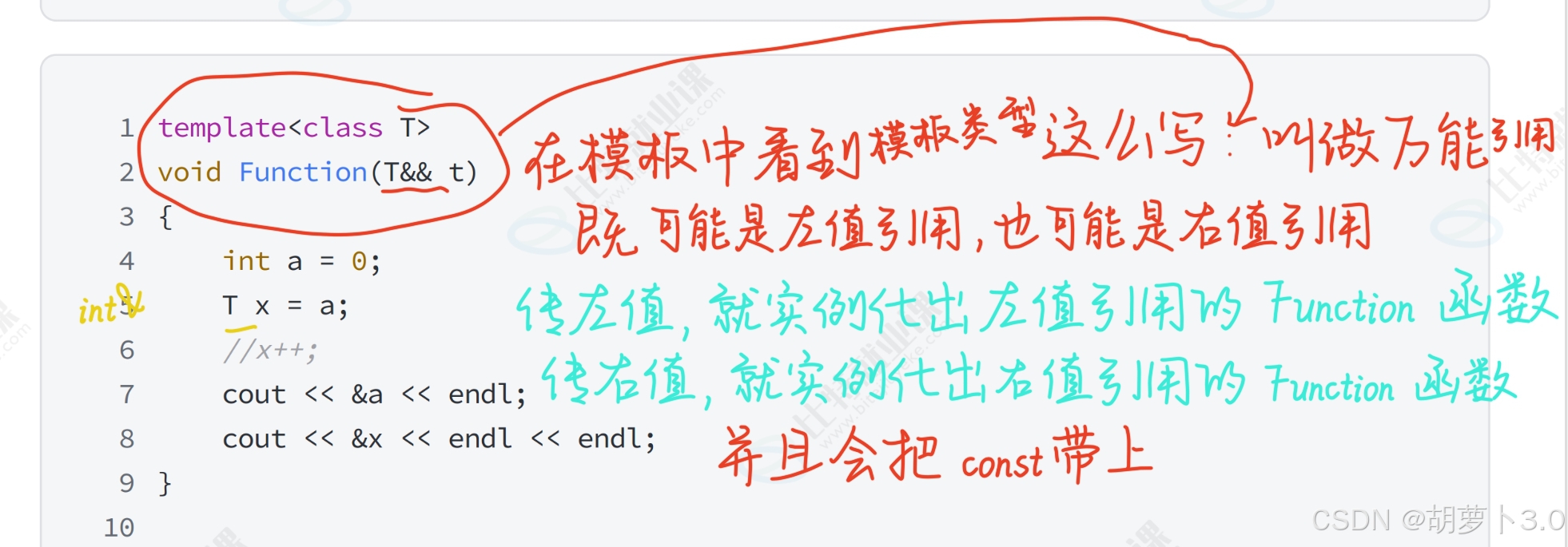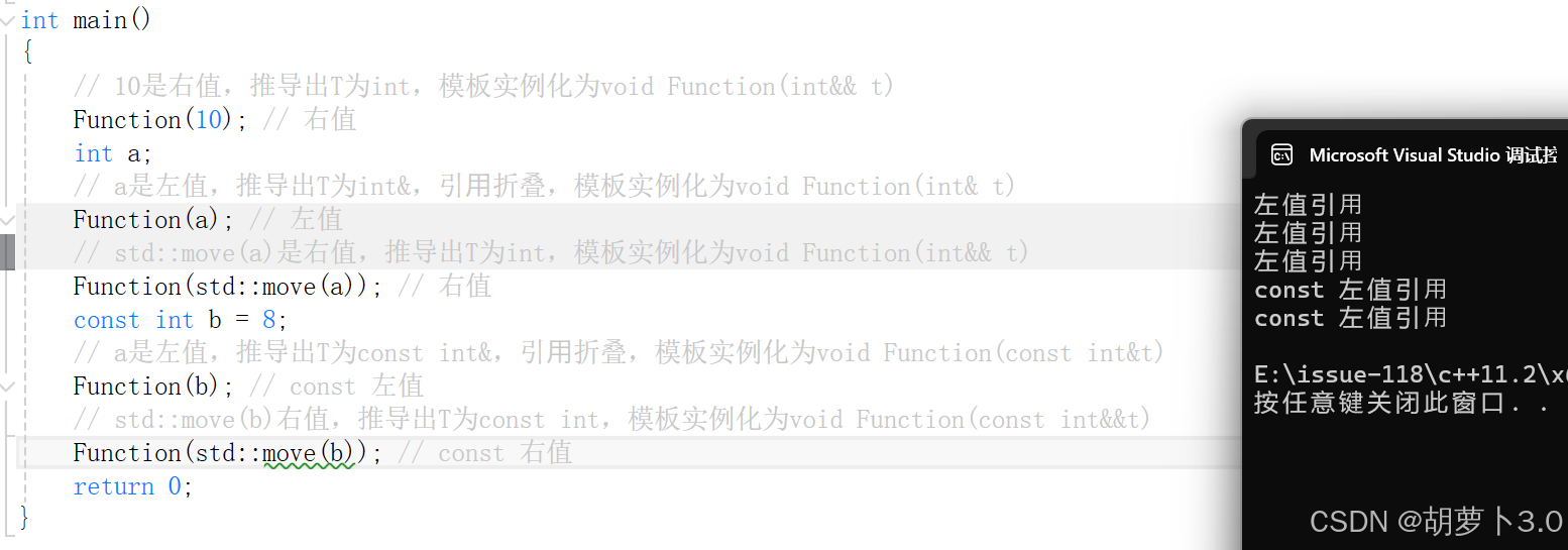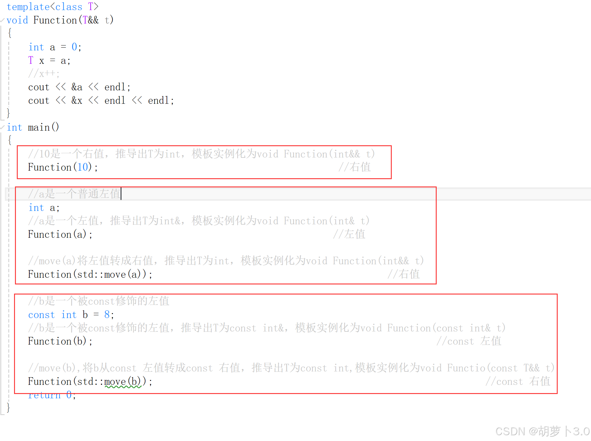 // std::move(b)右值,推导出T为const int,模板实例化为void Function(const int&&t)