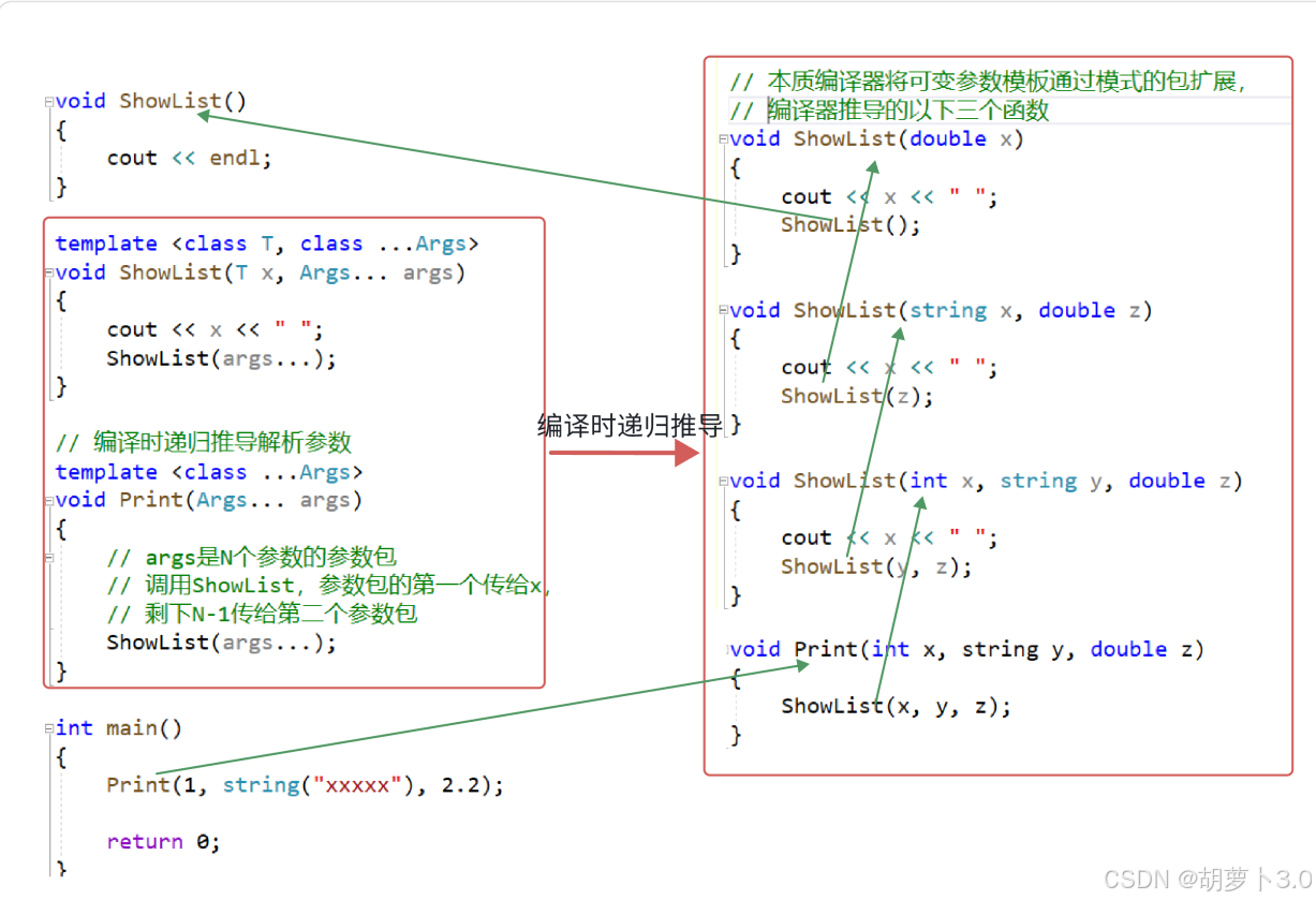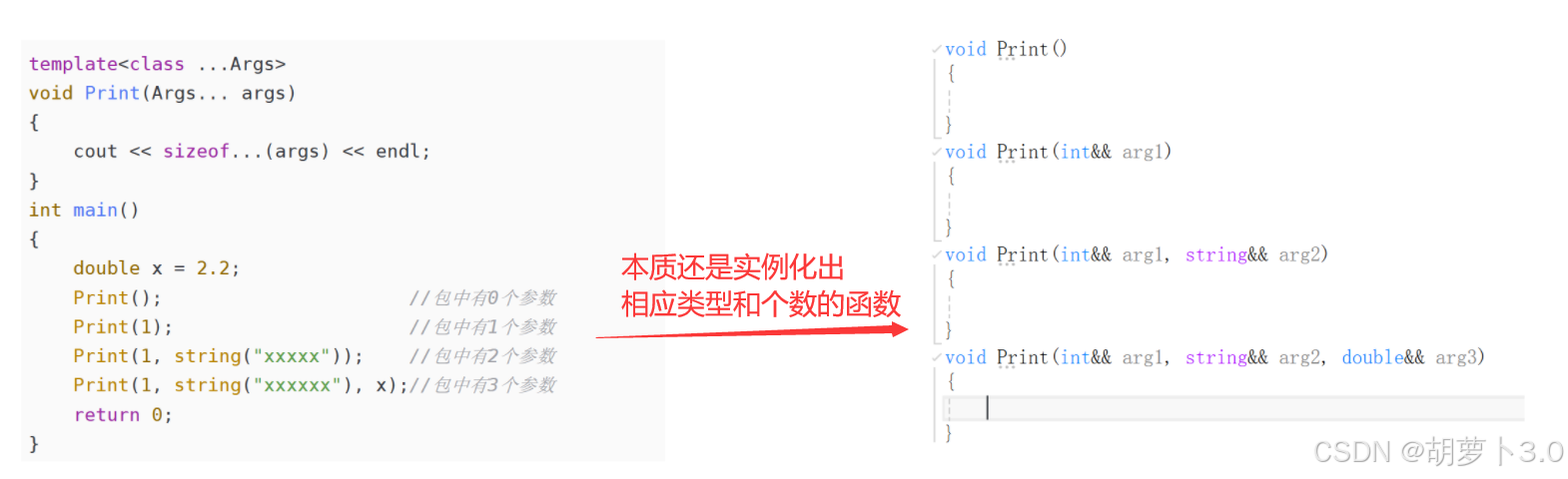可变模板参数的原理跟模板一样,本质还是去实例化对应类型和个数的多个函数
