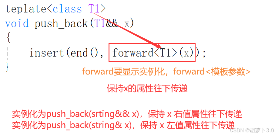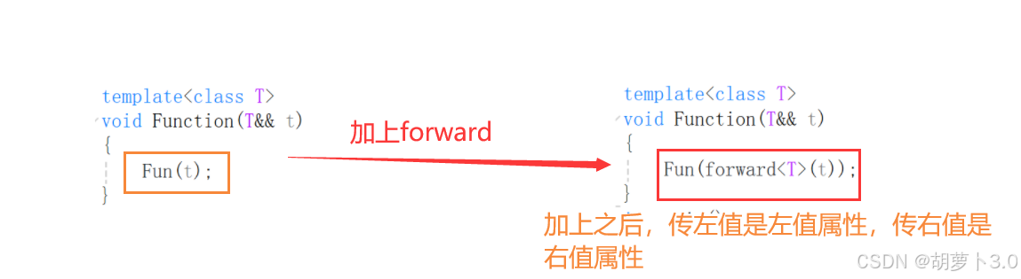 forward可以识别是左值引用还是右值引用,如果是左值引用,就保持左值的属性;如果是右值引用(属性退化成左值),会再把你转换成右值,保持你的属性