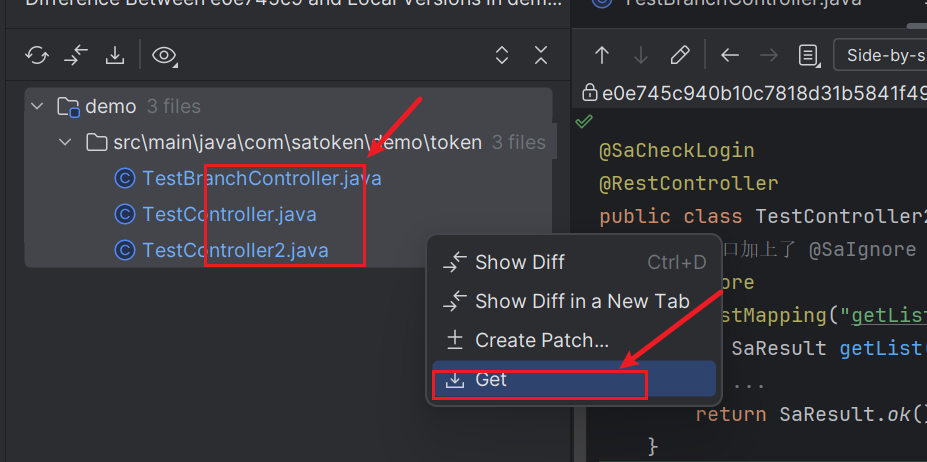 确定要回退的代码后,选择某个文件或者ctrl+A 全选文件 ,右键-》Get 拉取到本地