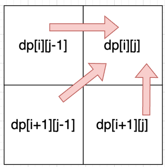 4.确定遍历顺序:从递推公式可以看出,dp[i][j]依赖于dp[i + 1][j - 1],dp[i + 1][j]和dp[i][j - 1],如下图所示。因此遍历顺序为从下到上,从左到右