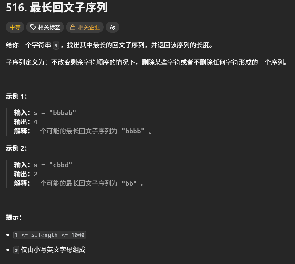 思路:本题是求回文子序列,而不是回文子串。回文子串要求一定连续,但回文子序列可以不连续。