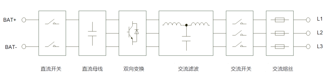 电网 -> PCS(AC/DC) -> 内部直流母线。