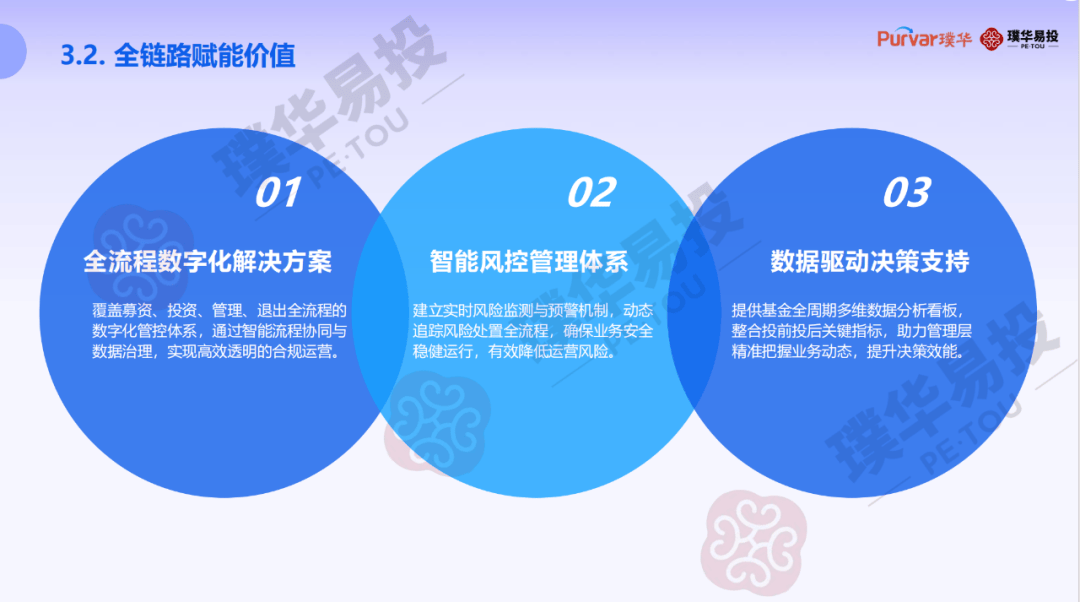 实现募、投、管、退全生命周期线上化管控,确保业务流程标准化、可视化。