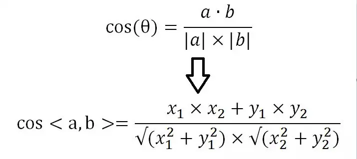 在数学中,我们通过测量两个向量的夹角的余弦值来度量它们之间的相似性,两个向量有相同的指向时,余弦相似度的值为1;两个向量夹角为90°时,余弦相似度的值为0;两个向量指向完全相反的方向时,余弦相似度的值为-1。名曰:"余弦相似性 "。最重要的是这一定律不仅仅适用在二维空间,对任何维度的向量空间中都适用,因此余弦相似性常用于高维正空间。例如在信息检索中,每个词项被赋予不同的维度,而一个文档由一个向量表示,其各个维度上的值对应于该词项在文档中出现的频率。余弦相似度因此可以给出两篇文档在其主题方面的相似度。