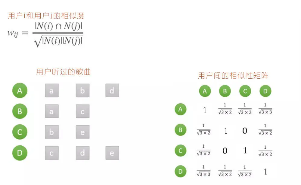 - N (i):用户 i 听过的音乐集合(比如用户 M 的 N (M)={《晴天》,《七里香》,《花海》})