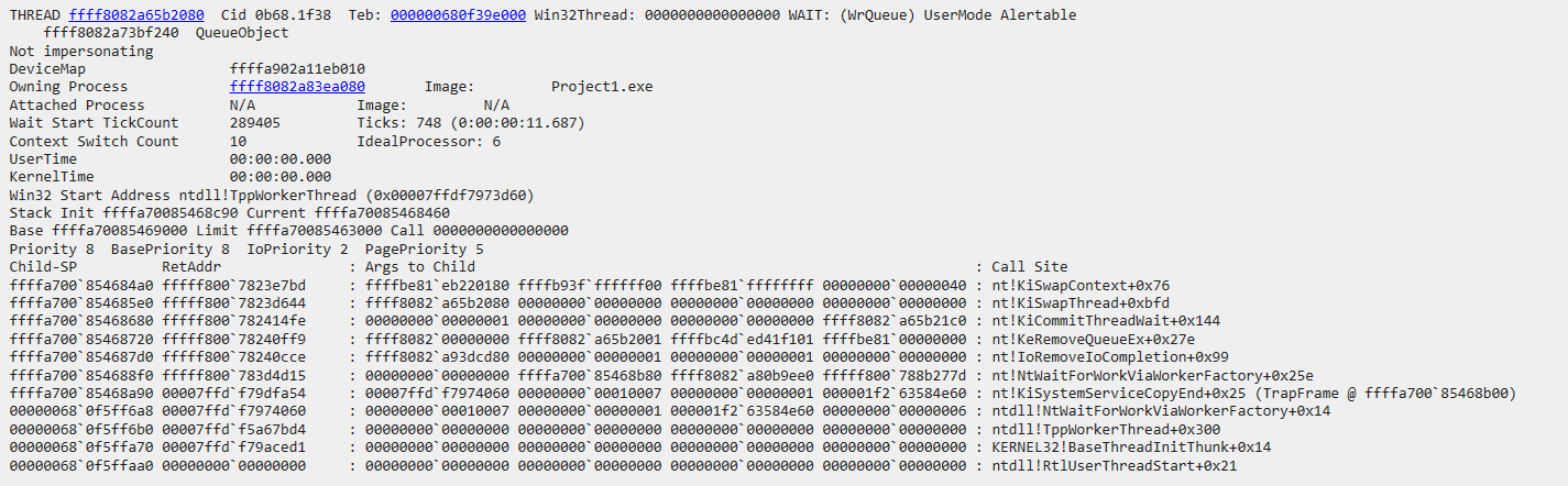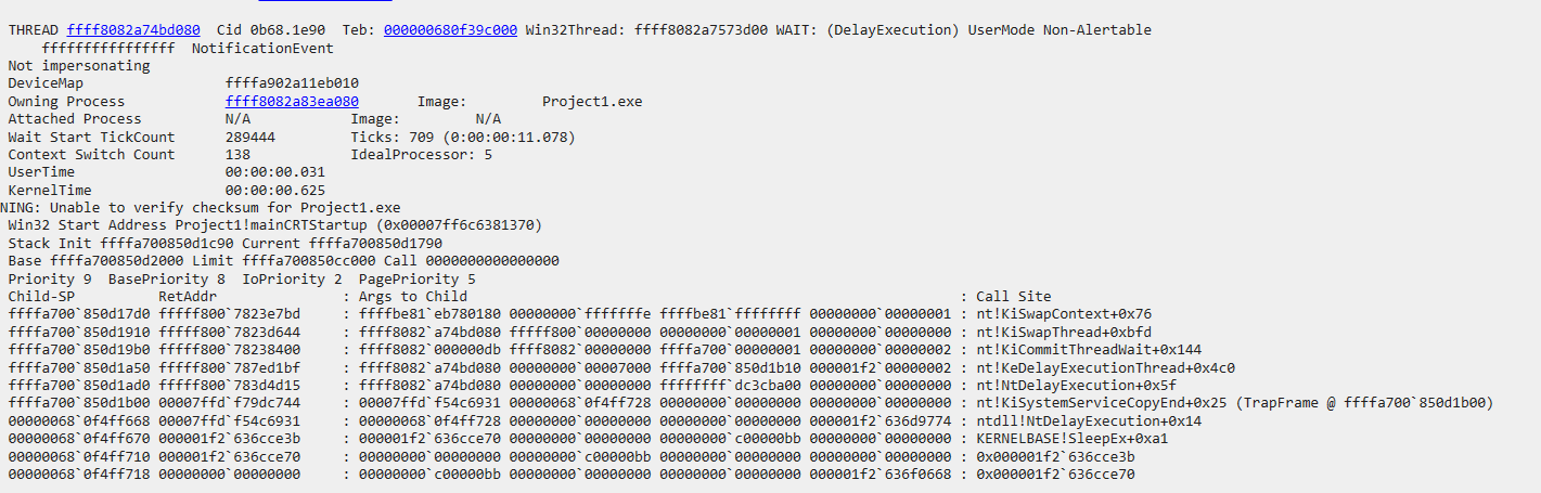 现在我们再来看一下哪个线程执行了shellcode,输入下面的命令查看 project1.exe 进程最详细信息。