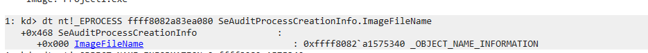 dt nt!_EPROCESS ffff8082a83ea080 SeAuditProcessCreationInfo.ImageFileName