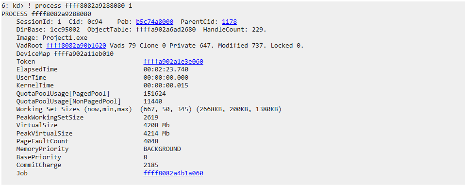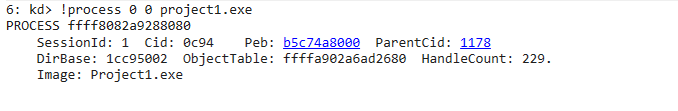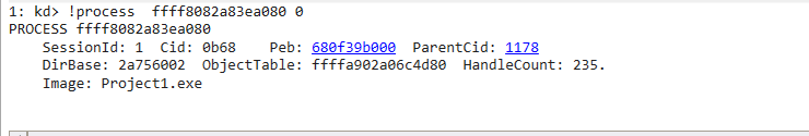这里知道了 project1.exe 的 EPROCESS 地址,我们可以通过查看 EPROCESS 地址,去查看更详细的进程信息,其中 1 为简单输出,7 是最详细的输出。