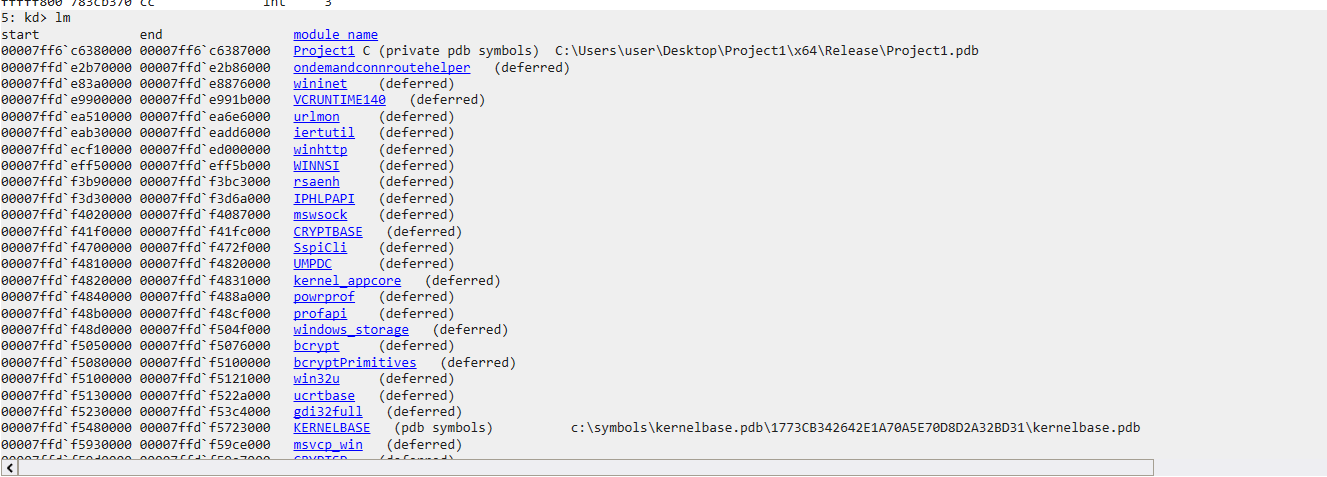 此时我们已近切换进去了,可以输入命令 lm 去查看加载了哪些DLL。