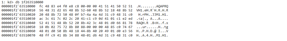 这里我解释一下为什么是查看起始地址的数据,而不是VAD地址的数据,因为VAD 地址相当于索引卡片,记录着一本书,放在哪一层,哪一个架子。如果你直接 db 查看VAD地址的内容,只能看到一堆指针啥的。起始地址才是我们要查看的那本书,里面存放shellcode。