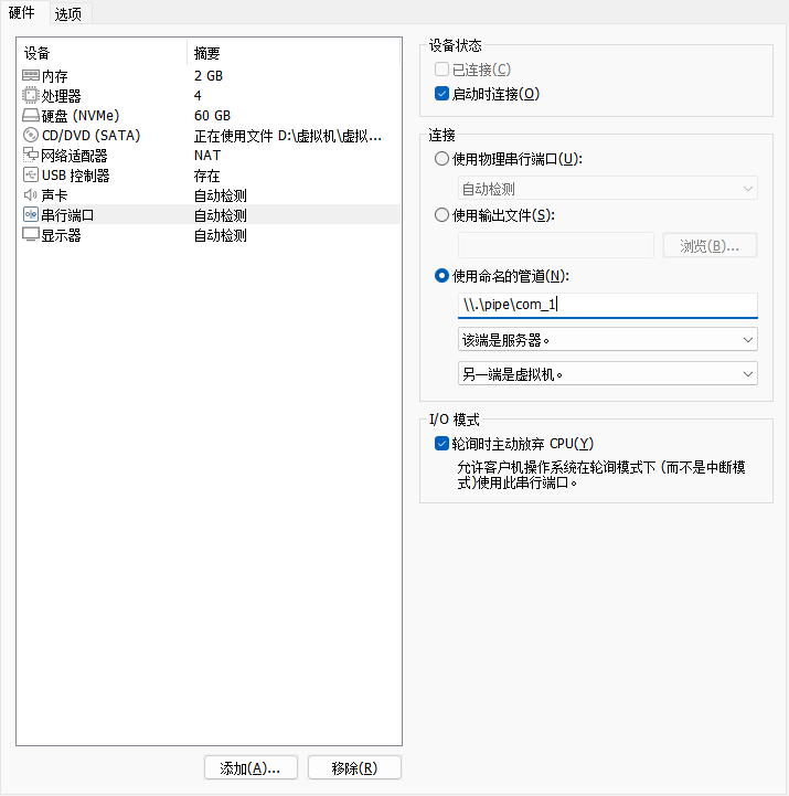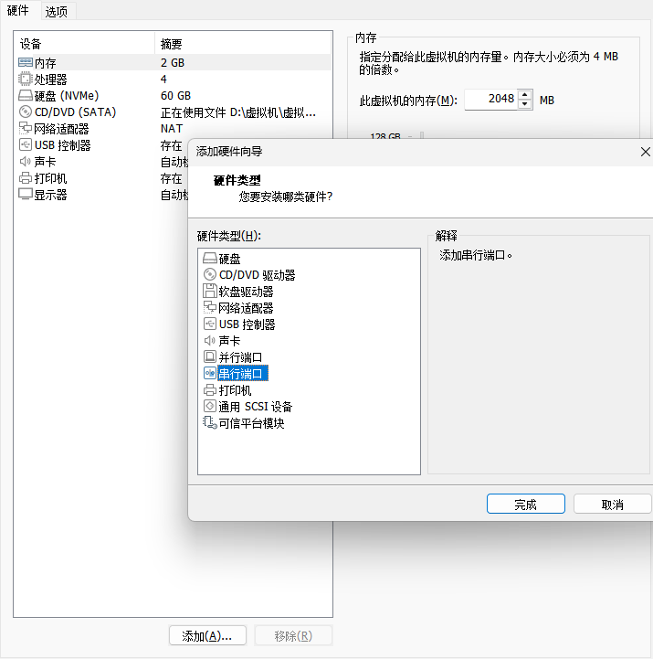 首先关闭虚拟机,然后编辑虚拟机设置 -> 添加 -> 串行端口 。