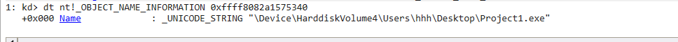然后输入下面命令,查看 _OBJECT_NAME_INFORMATION 结构体内容。
