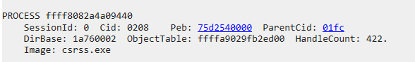 我们还可以查看一下进程的 PEB,以此来判断进程是否被伪造,输入下面命令查看指定进程的PEB。