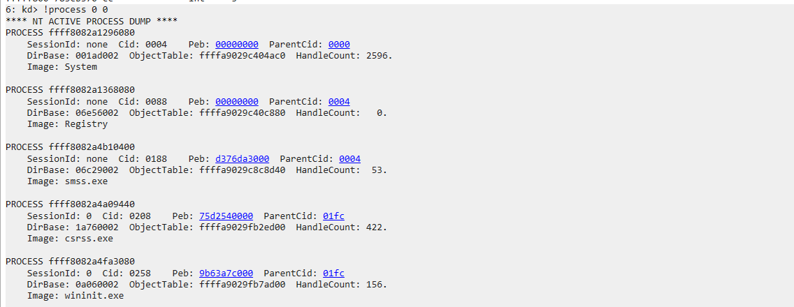 输入下面命令,列出当前Windows中正在运行的所有进程,这里要注意 !process 0 0 数据**来自内核态的 EPROCESS 链表 (ActiveProcessLinks),而不是用户态的进程列表。**所以,有些 rootkit 即使在用户态隐藏了进程,我们还是可以在内核态找到。