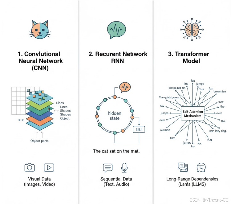 深度学习中采用了各种类型的神经网络,每种网络都有其独特的优势和常见的用例,最常见的有卷积神经网络、循环神经网络以及转换器(Transformer),它们在"自然语言处理"和"计算机视觉领域"发挥着重要作用。