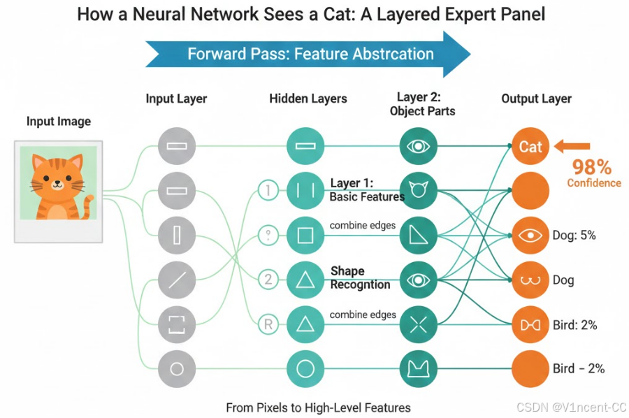 你可以把神经网络想象成一个由多层专家组成的 "专家评审团",当处理复杂的任务时,比如判断一张图片上是不是一只猫,第一层神经元可以识别图像中的基本特征(例如边缘),下一层可能会将这些边缘组合起来识别形状,再下一层可能会识别毛发图案,依此类推,直到最后一层将整幅图像识别为一只猫。