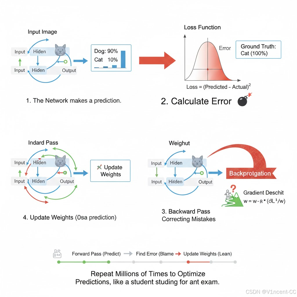 - 发现误差:在训练开始时,网络的权重是随机初始化的,所以其预测结果往往是错误的,为了衡量预测结果(输出)与正确答案(标签)之间的差距,我们使用一个损失函数来量化"误差"的大小,损失值越大,表示模型的预测越不准确。