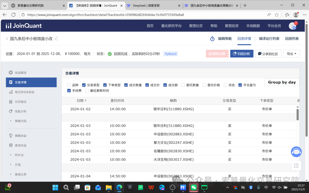 过拟合风险:策略中包含了大量参数(如市值区间、持股数量范围、止损止盈阈值、空仓月份、均线参数等)。这些参数在历史回测中可能被优化至最佳状态,但在未来市场环境变化时可能失效。