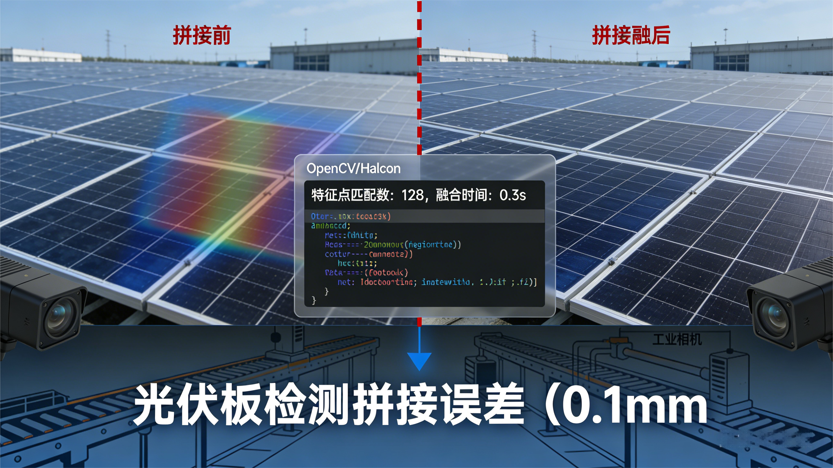 做工业视觉检测的都遇到过这个问题:多相机拼接大视野时,重叠区域总会出现"重影、色差、拼接缝明显"的情况,明明硬件同步做好了,结果拼接后的图像还是没法用------要么边缘错位,要么同一物体在重叠区出现双影,直接影响缺陷检测的精度。