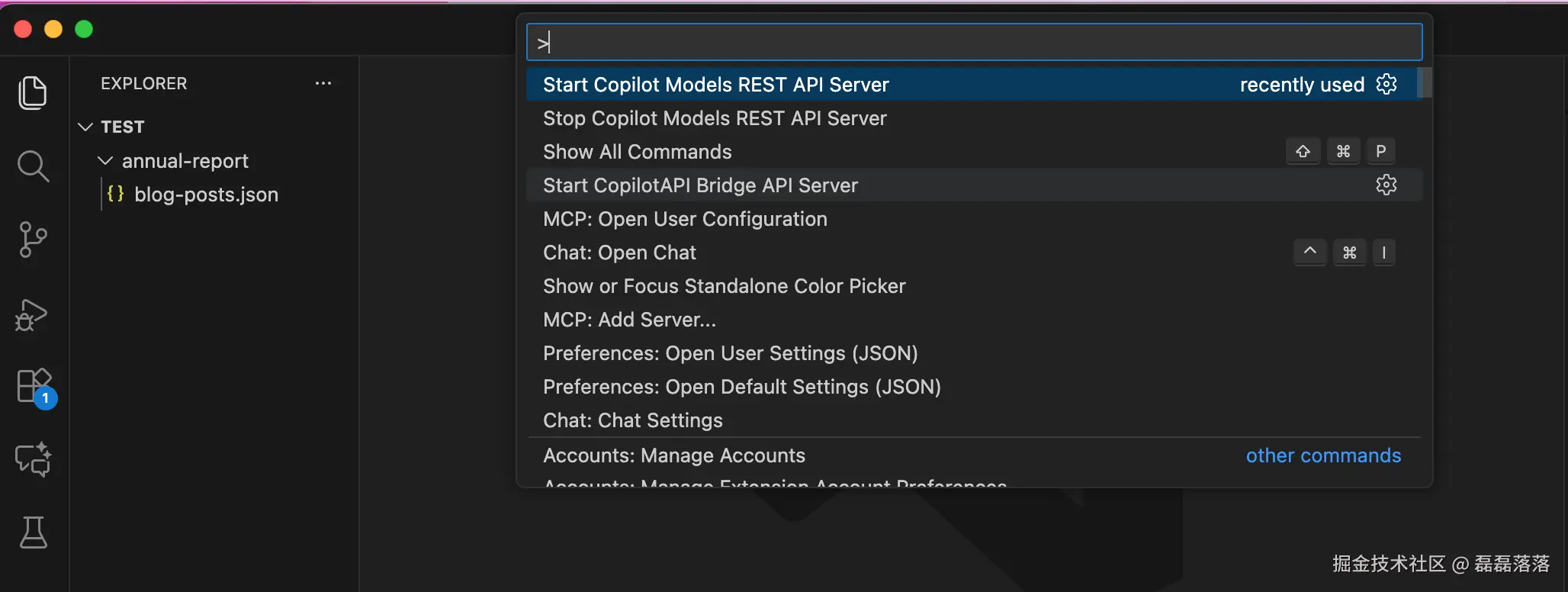 扩展安装成功后,在 VS Code 键入「Ctrl + Shift + P」后,点击「Start Copilot Models REST API Server」命令,即可启动 API Server。