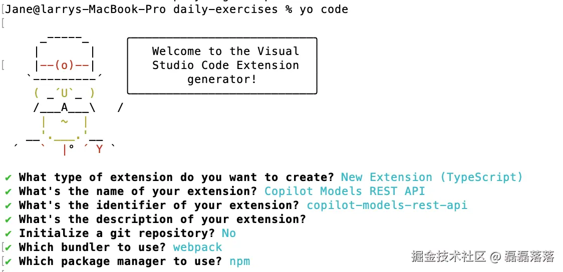 下面使用 yo code 命令生成 VS Code 扩展工程 copilot-models-rest-api 的脚手架: