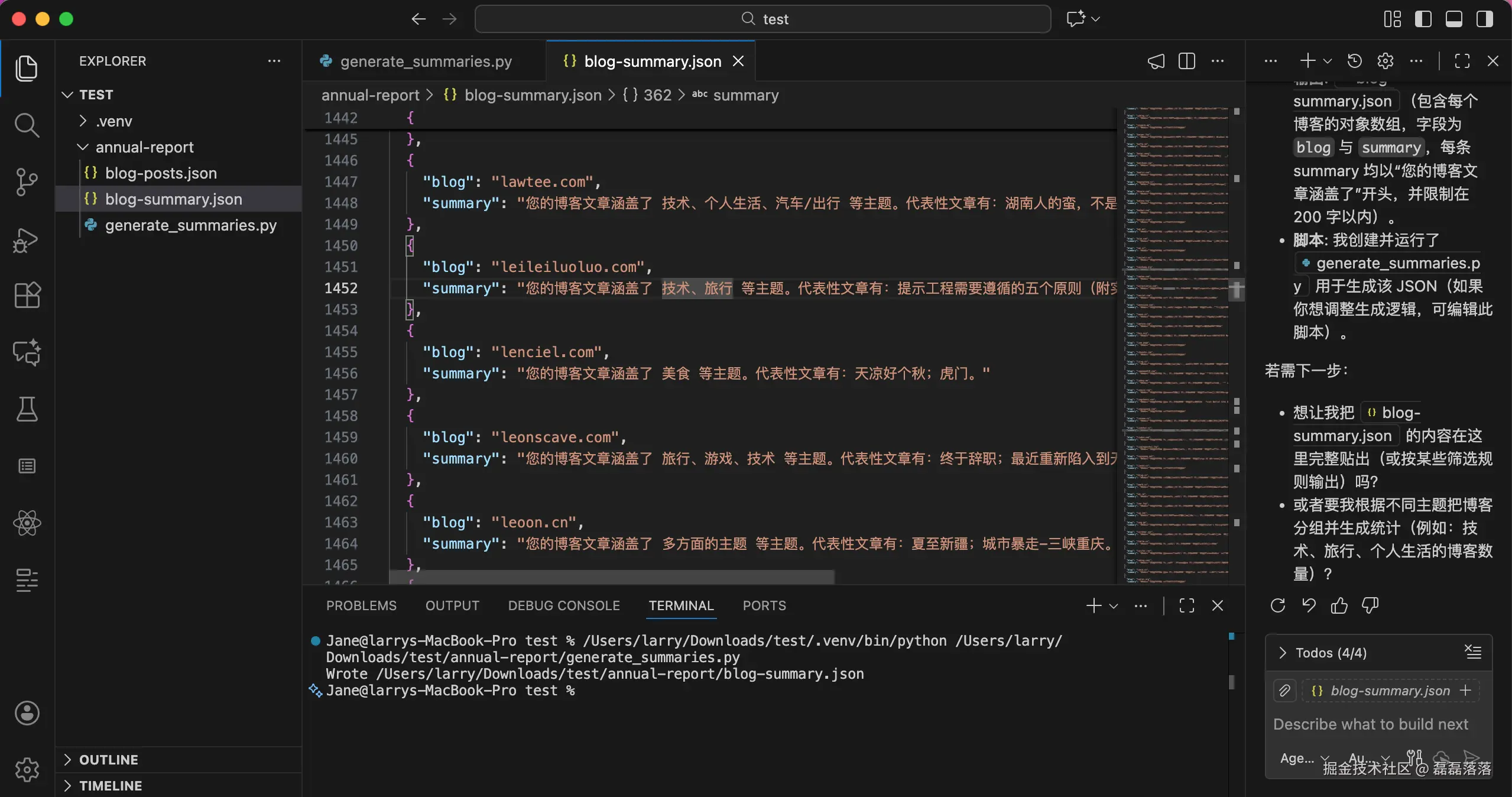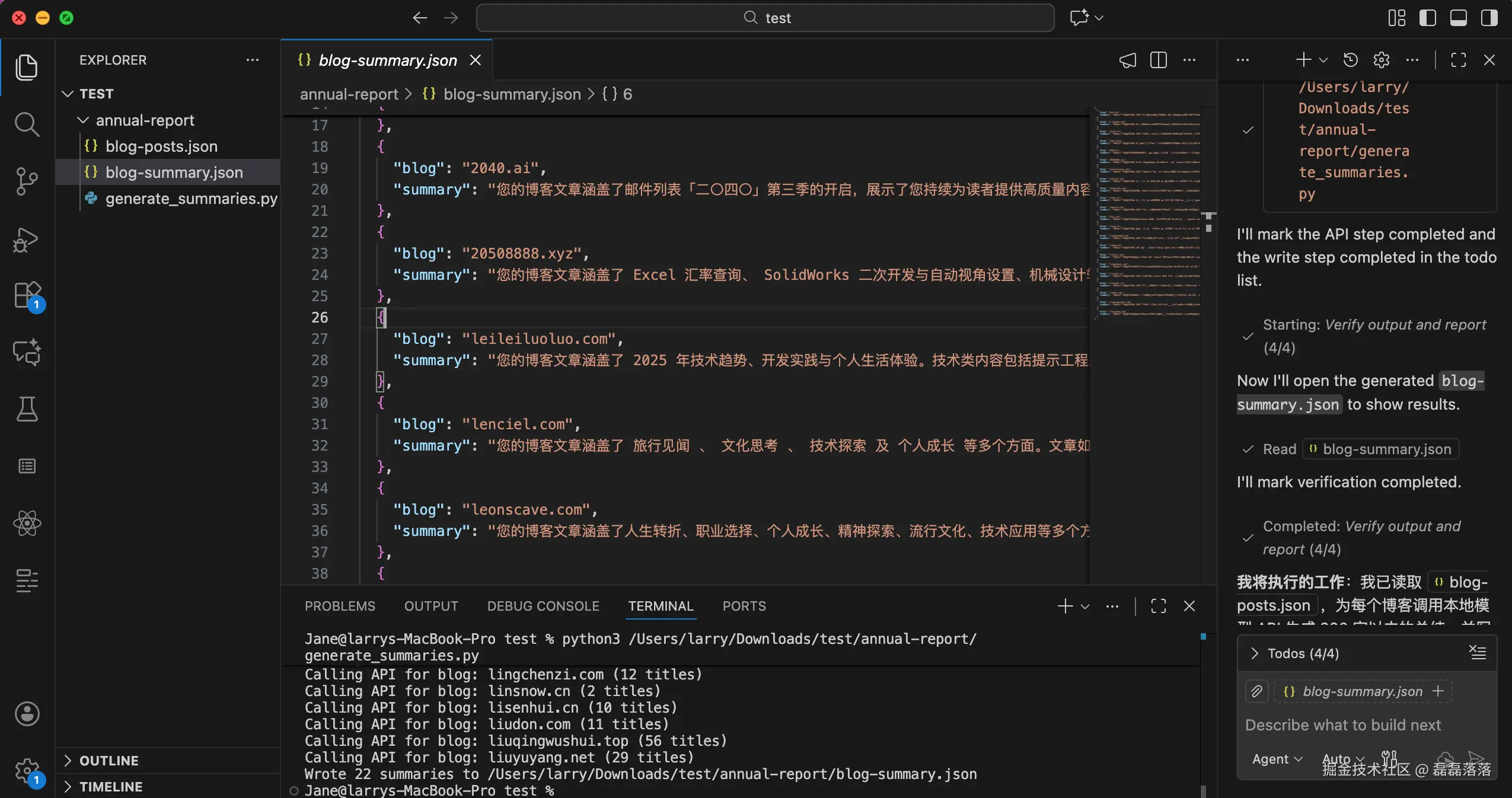 最后以 `blog-summary.json` 为文件名,输出一个包含所有博客总结的 JSON 数组,格式如下: