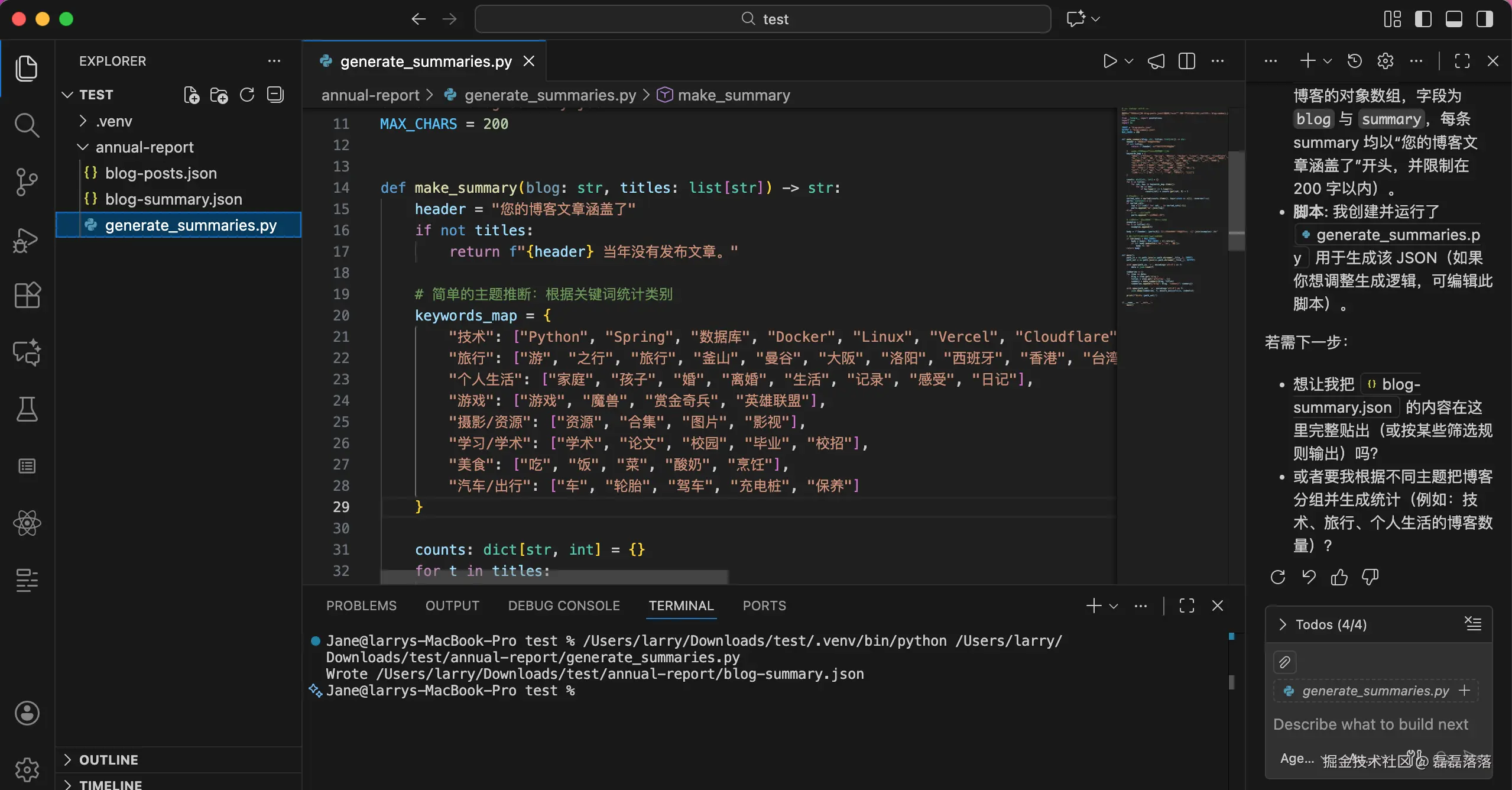 提示词发出后,Copilot 修改原先的 Python 脚本,改为调用 OpenAI 来生成总结。但是要使用这个程序我们需要有 OpenAI 账号,即必须提供一个 OPENAI_API_KEY 给 Copilot。