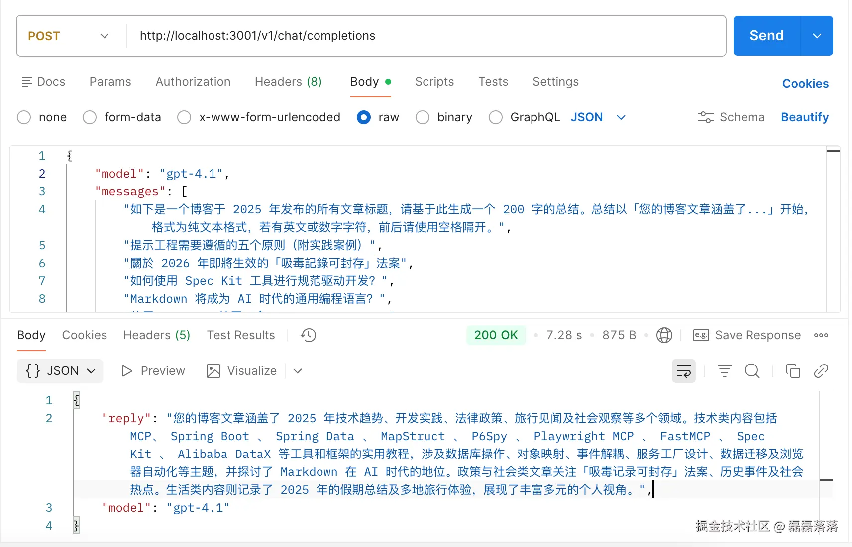 Server 启动成功后,尝试用 Postman 调用一下和模型对话的 API,咨询模型的结果被成功返回。