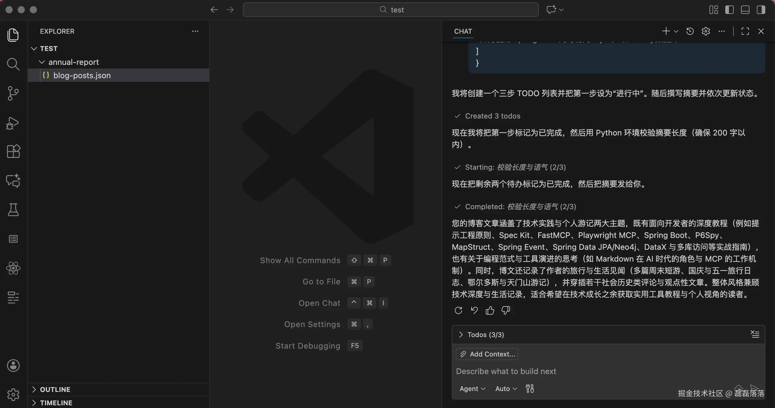 下面,我们在 VS Code 安装上面生成的 vsix 扩展,然后尝试重新编写提示词,看看其能否实现文章开头的「批量生成博客年度总结」的需求。