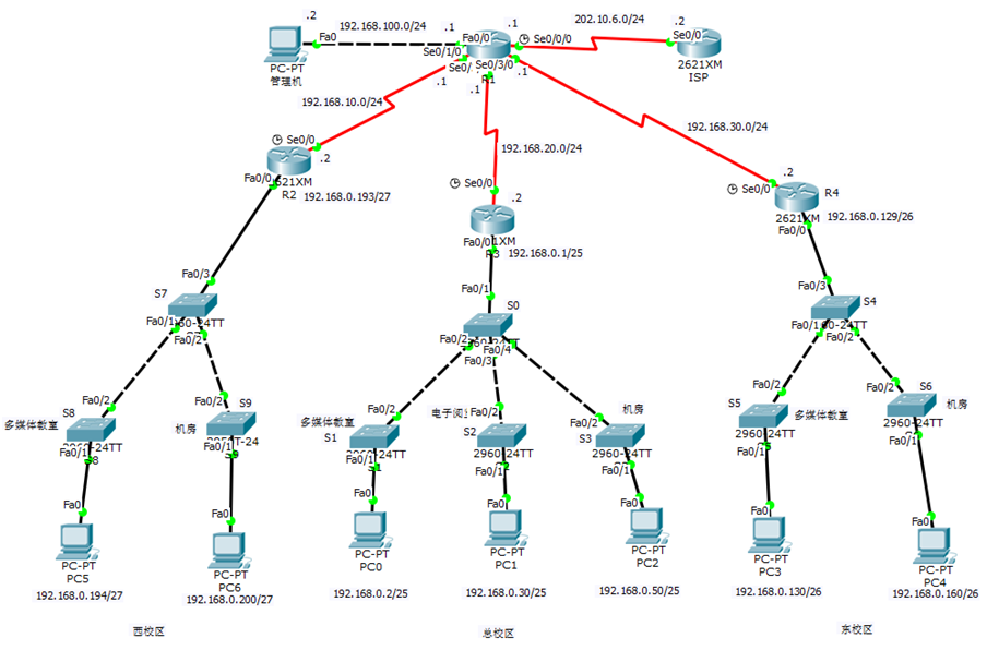 总校区:IP为192.168.0.1~126,子网掩码为255.255.255.128