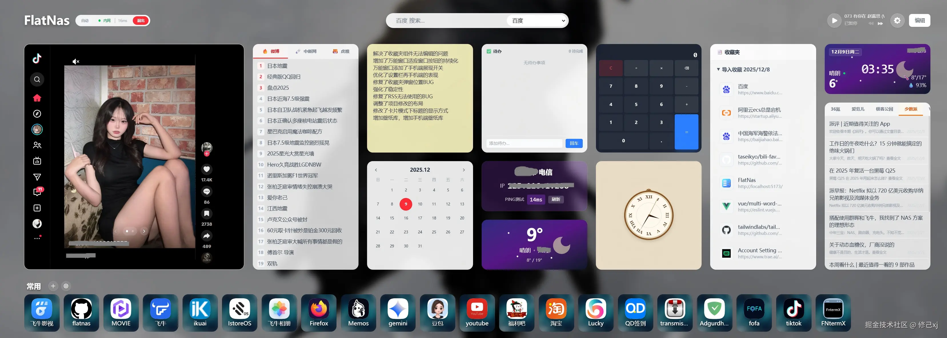 简单来说,FlatNas 就是你的浏览器起始页+个人仪表盘,让你在一个页面上管理所有日常所需,告别杂乱无章的书签和散落各处的工具。