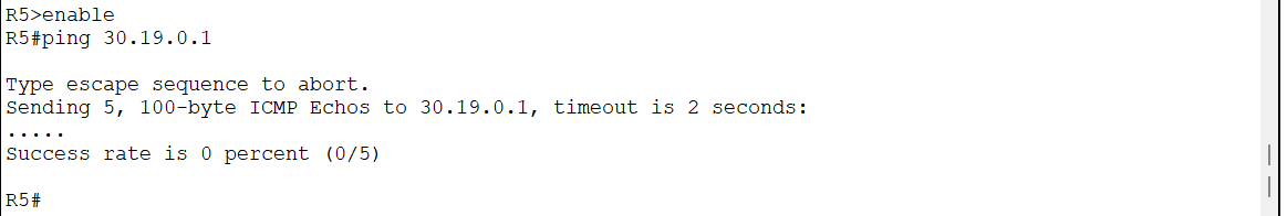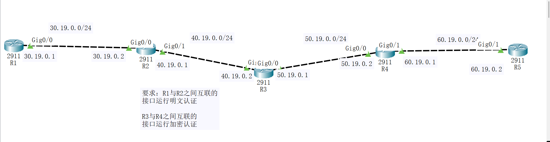 GigabitEthernet 0/0接口补配相同的明文认证(密钥:123)。再次在 R5 上ping 30.19.0.1,结果为 成功。