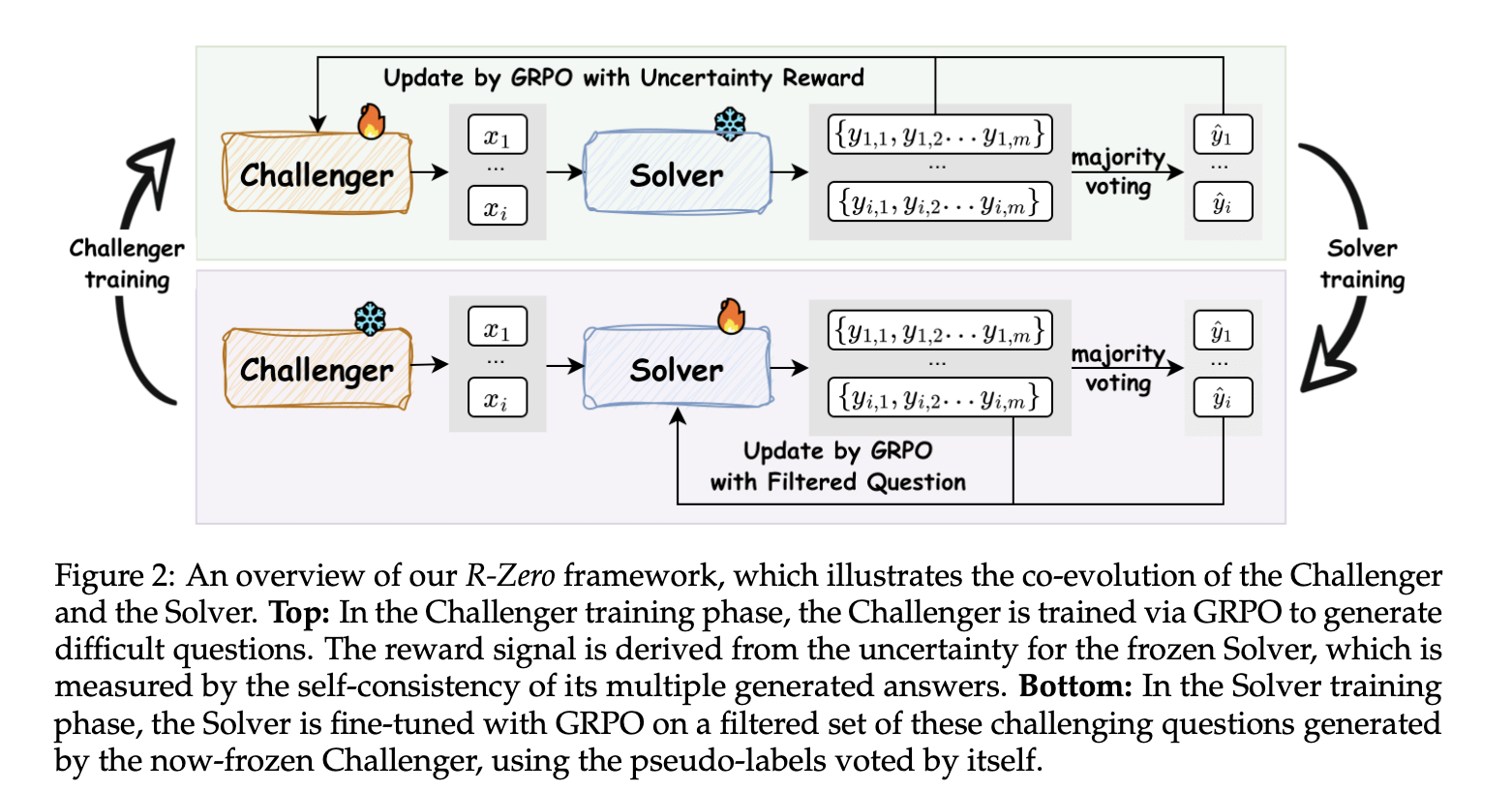 - 后续迭代:Challenger基于当前Solver的不确定性优化,生成更难的问题;Solver则在过滤数据集上提升。