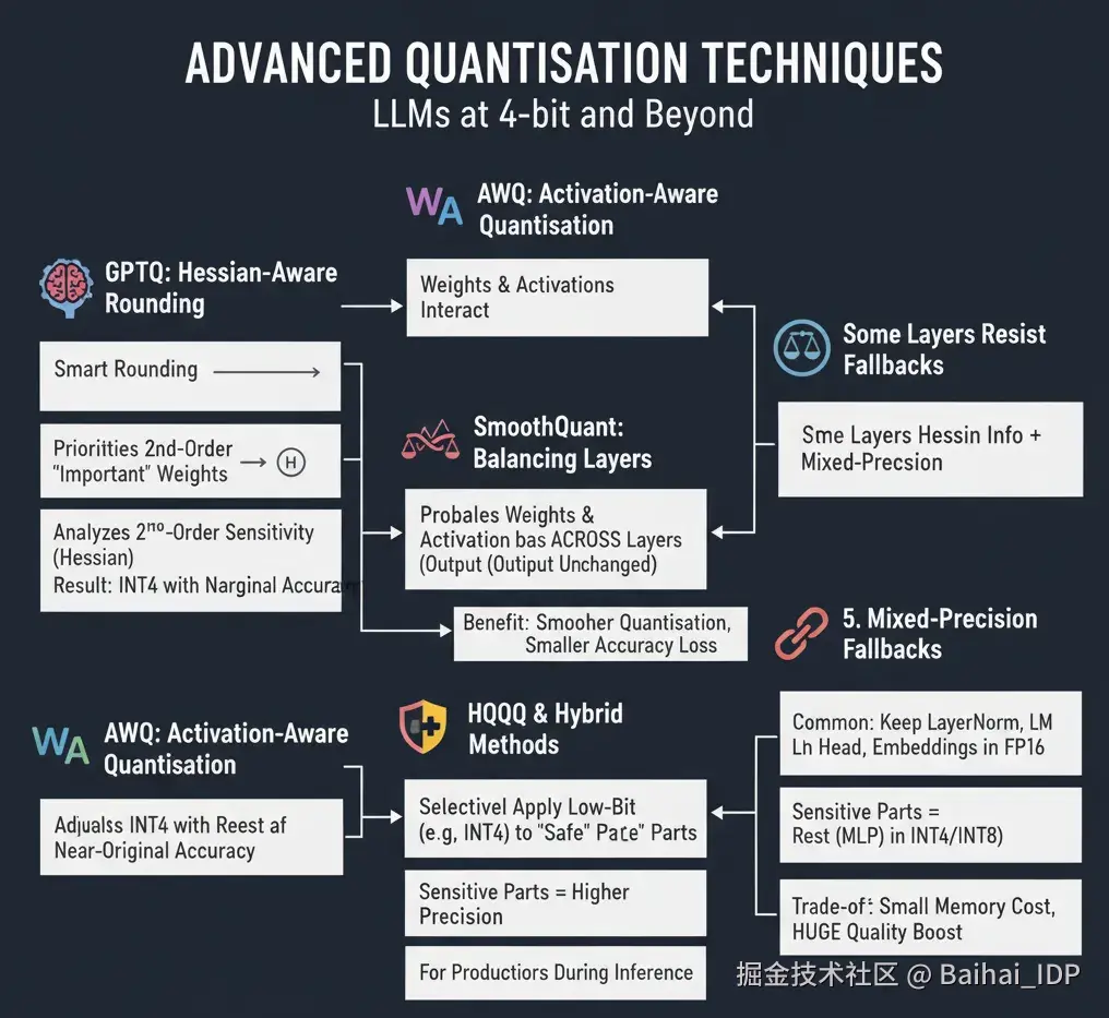 在经历了取整、截断和敏感网络层带来的种种挑战后,研究人员和工程师们开发出一些巧妙的方法,使得 LLM 即使在 4 位精度下也能表现出色。以下是我了解到的一些核心技术。
