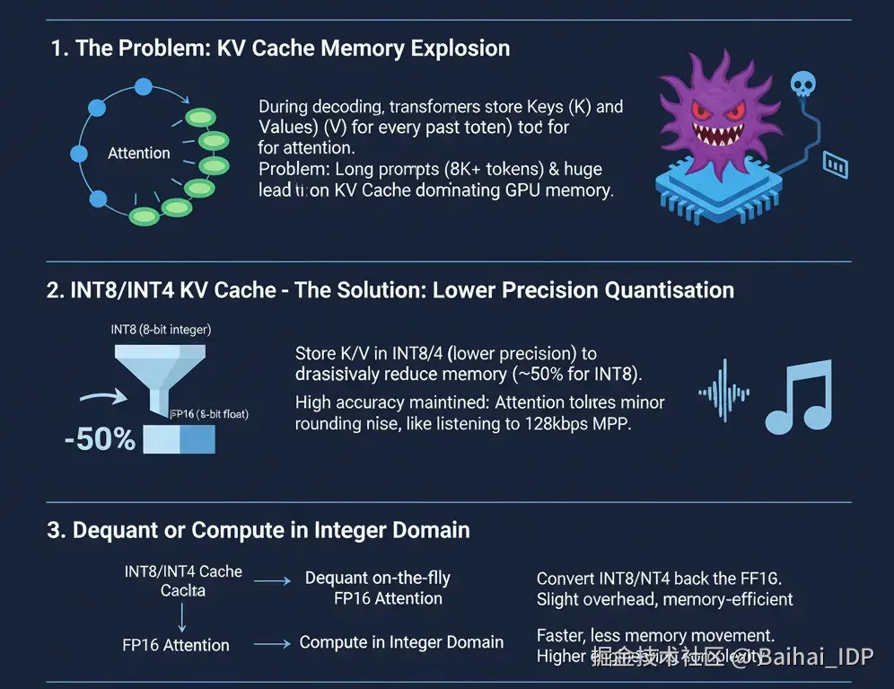 - 将键和值以更低精度(如 INT8 或 INT4)存储,可大幅减少内存占用。