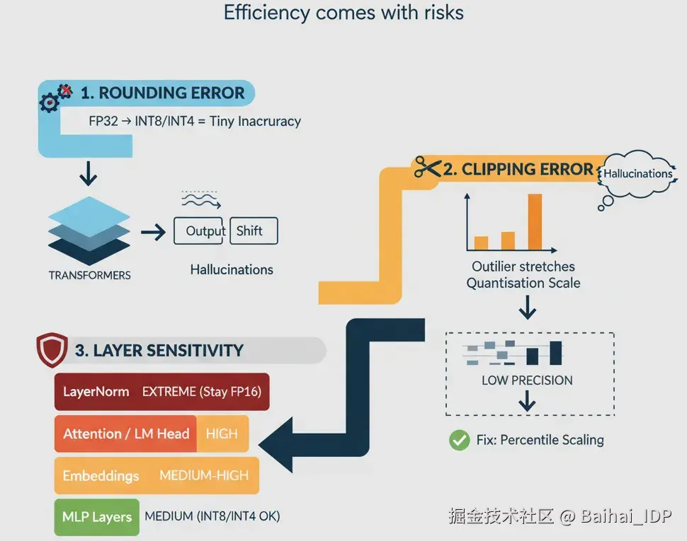 - 单次误差很小,但在 Transformer 中,微小的取整误差会跨层累积。