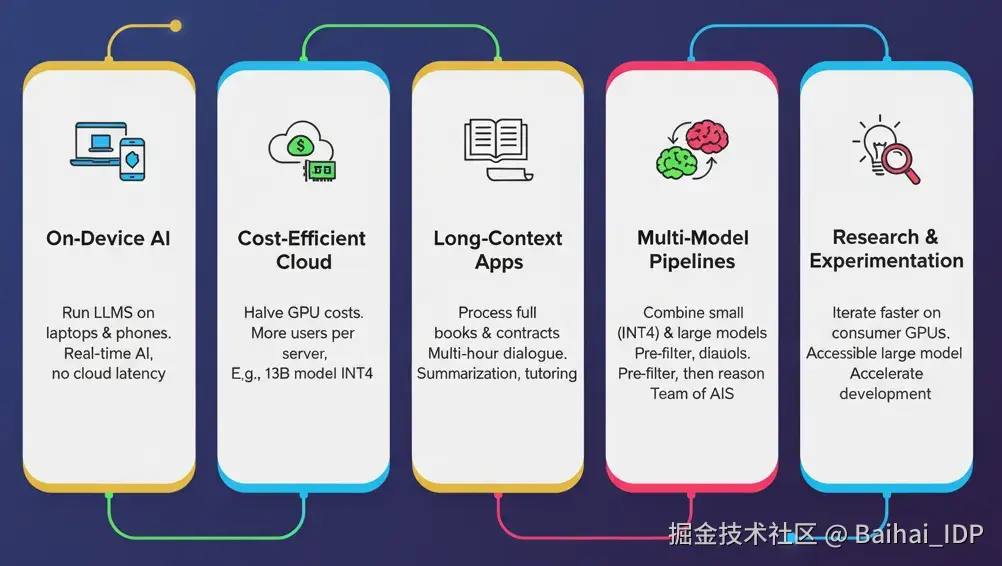 - 端侧 AI(On-Device AI) :量化让我能直接在笔记本、边缘设备甚至手机上运行大语言模型。过去需要多卡 GPU 服务器的模型,如今单张 GPU 就能装下,让 AI 能够进行实时交互,摆脱云端延迟。我用它来做笔记、进行代码补全、当离线聊天助手 ------ 就像把一台超级计算机装进了背包里。