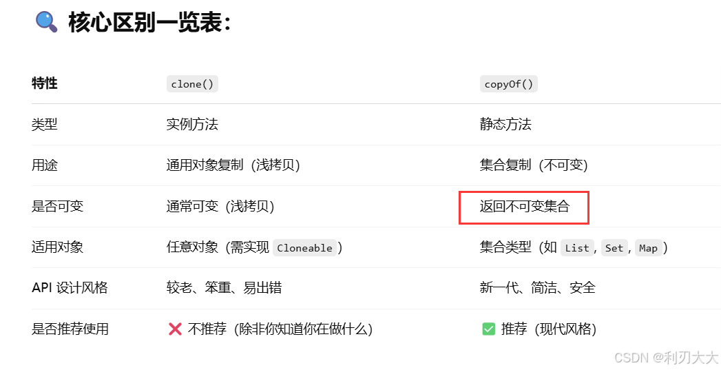 List<Integer> tmp = null表示tmp是没有引用任何对象 ,而List<Integer> tmp = new ArrayList<>()表示有引用对象,但只是一个空盒子! List.copyOf()方法返回的List是不可变的!- 下图是两个拷贝函数的区别: