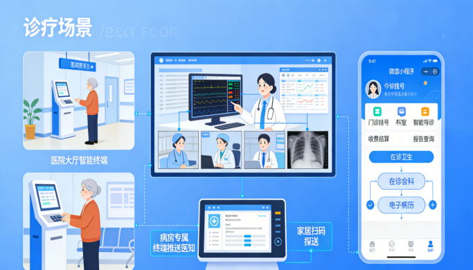 针对老年患者等特殊群体,终端配备语音交互与大字模式,降低操作门槛。诊室内部,高清显示终端实时同步患者电子病历、检查影像、检验报告等核心信息,支持多科室医护人员在线会诊,打破信息壁垒,有效提升诊断精准度与诊疗效率;病房内专属终端可实现医嘱实时推送、用药提醒、护理等级公示,同时开通家属探视预约通道,家属线上预约后凭二维码有序探视,既保障病房秩序,又搭建起医患及家属的高效沟通桥梁。