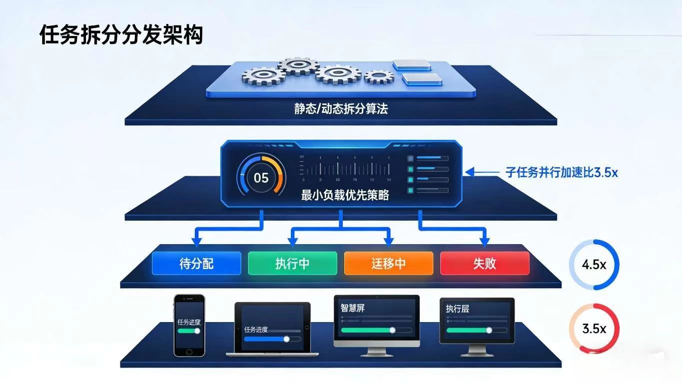 - 解决方案:1. 实现动态拆分算法,根据设备数量与任务类型自动调整拆分粒度;2. 建立拆分粒度评估模型,基于历史执行数据优化拆分策略;3. 支持开发者手动配置拆分粒度参数,适配特殊业务场景。