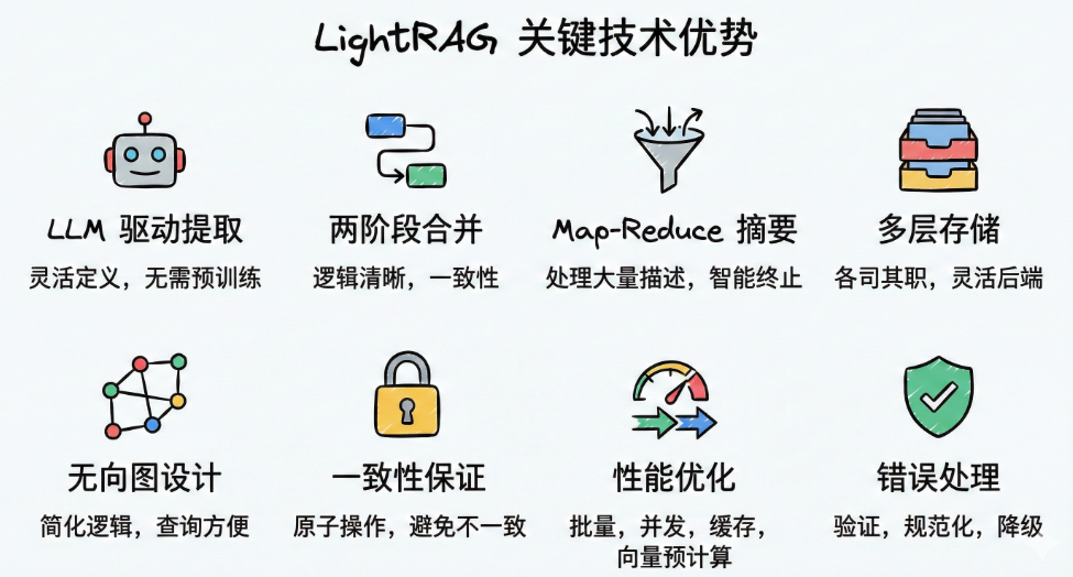 LightRAG 在知识图谱实现中采用了八项关键技术,每项技术都针对特定的挑战和需求进行了优化设计。